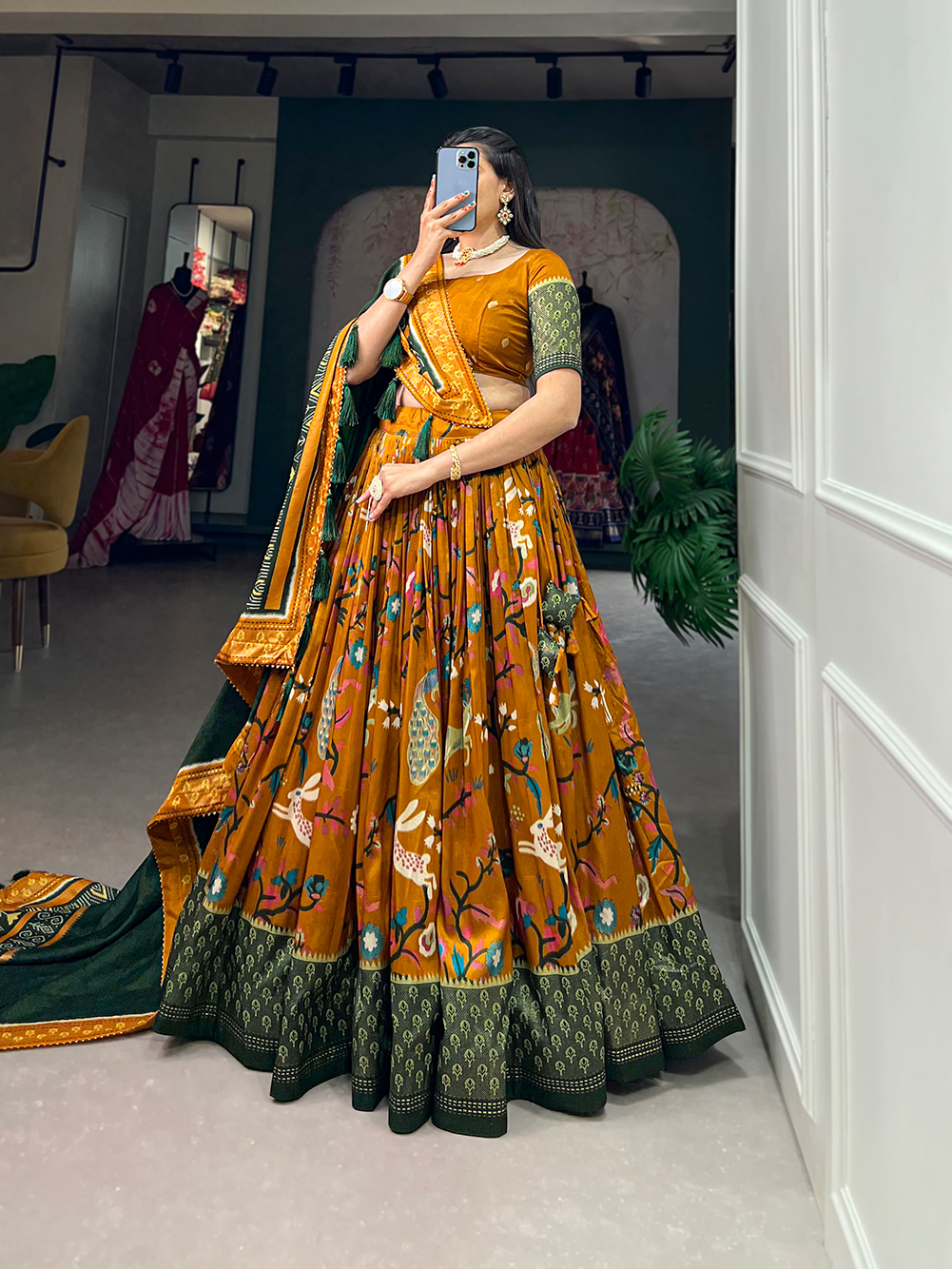 Elevate your festive style with our Rabbit Collection Chaniya Choli. This 3-piece set features a beautifully stitched Tussar Silk Lehenga with Dot & Ikkat prints, paired with an unstitched matching blouse and a graceful 2.5-meter Dupatta adorned with Gotta Patti Lace and tassels. Designed for elegance and comfort with an adjustable waist and premium micro-cotton lining. Perfect for any celebration!
