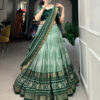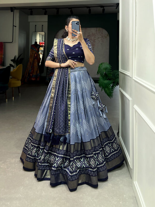 Step into the world of modern ethnic elegance with the Zigzag Collection. Featuring a stunning blend of Dot and Ikkat prints with foil work, this lehenga is made from luxurious Tussar Silk. The lehenga comfortably fits up to a 42-inch waist with a drawstring closure, heavy tassels, and a zip. Its 42-inch length and 3.40-meter flair provide a graceful and voluminous silhouette, while the micro cotton inner ensures comfort. The unstitched blouse, also crafted from Tussar Silk with Ikkat print and foil work, is designed for a perfect match. The dupatta completes the look with an Ikkat print and Gotta Patti lace border with tassels for added charm.
